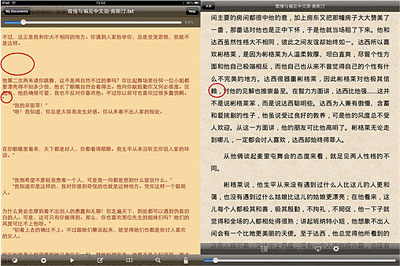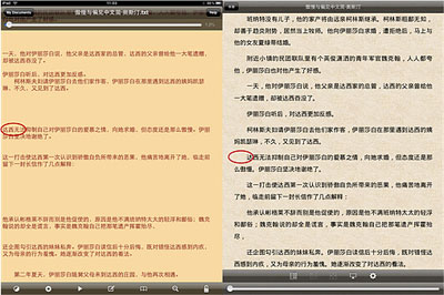 下圖左側(cè)是GoodReader中不處理空行的閱讀效果,顯而易見,存在很多無用空行,而在Apabi Reader中選擇“忽略所有空行”后,閱讀體驗有明顯改進;此外,Apabi Reader 對中文排版的支持性也非常不錯,例如從左圖可以看出,原始TXT文檔是缺少首行縮進排版信息的,而Apabi Reader則對段首縮進兩字符做了相應處理: