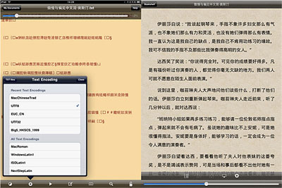 Apabi Reader在閱讀TXT時另一個優(yōu)勢在于閱讀器能夠智能識別主流的TXT文字編碼并做出相應的自動調(diào)整,對于中國用戶來說,這無疑是一個很貼心的功能。某些閱讀器軟件例如GoodReader閱讀中文TXT時由于無法識別中文編碼會造成亂碼問題,需要用戶手動從編碼列表中選出正確的編碼才能顯示文字,而Apabi Reader則為用戶省去了這一繁瑣的過程。