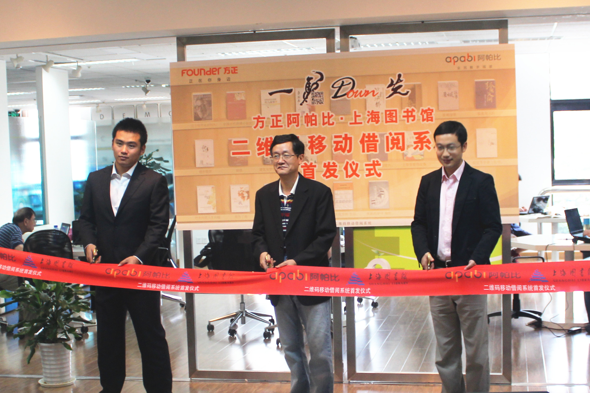 9月25日,“一碼down先”——方正阿帕比二維碼移動借閱系統(tǒng)首發(fā)儀式在上海圖書館新技術(shù)體驗(yàn)中心隆重舉行。上海圖書館副館長周德明、讀者服務(wù)部主任劉燕、采編中心主任倪道敏、系統(tǒng)網(wǎng)絡(luò)中心趙亮等領(lǐng)導(dǎo)以及方正阿帕比社會文化行業(yè)總監(jiān)戴鵬、產(chǎn)品經(jīng)理張子劍等參加了該儀式并進(jìn)行了剪彩活動。