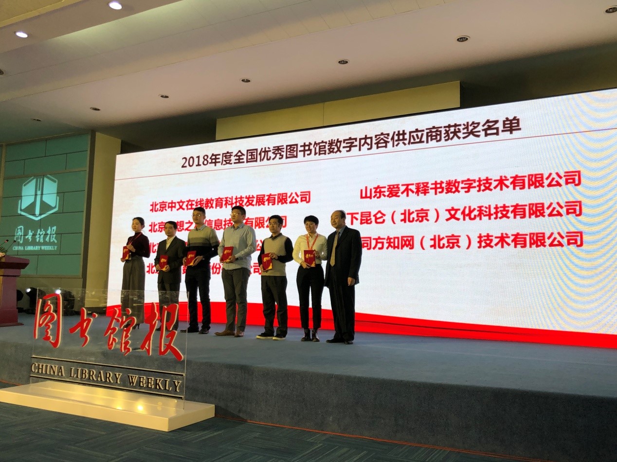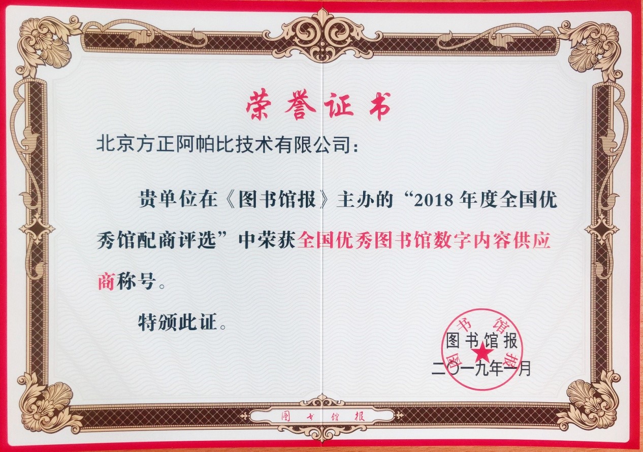 論壇期間進(jìn)行了全國優(yōu)秀館配商頒獎典禮,這是館配行業(yè)共建共享的權(quán)威評選活動,也是業(yè)內(nèi)公認(rèn)的評價館配企業(yè)的重要參考指標(biāo)。在2018全國優(yōu)秀館配商評選活動中,北京方正阿帕比技術(shù)有限公司脫穎而出,獲得“2018全國優(yōu)秀圖書館數(shù)字內(nèi)容供應(yīng)商”殊榮。