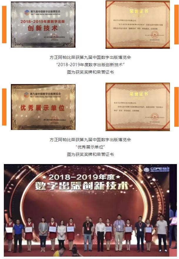 方正阿帕比榮獲第九屆中國(guó)數(shù)字出版博覽會(huì)“2018-2019 年度數(shù)字出版創(chuàng)新技術(shù)”圖為獲獎(jiǎng)獎(jiǎng)牌和榮譽(yù)證書(shū)