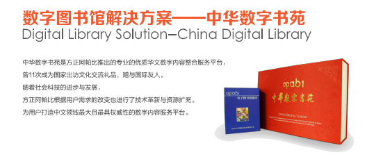 中華數(shù)字書(shū)苑是方正阿帕比推出的專(zhuān)業(yè)優(yōu)質(zhì)華文數(shù)字內(nèi)容整合服務(wù)平臺(tái),收錄了建國(guó)以來(lái)大部分的圖書(shū)全文資源、全國(guó)各級(jí)各類(lèi)報(bào)紙及年鑒、工具書(shū)、圖片等特色資源產(chǎn)品,旨在為圖書(shū)館、學(xué)校、企業(yè)、政府等客戶(hù)及其所屬讀者提供在線閱讀、全文檢索、離線借閱、移動(dòng)閱讀、下載、打印等數(shù)字內(nèi)容和知識(shí)服務(wù)。