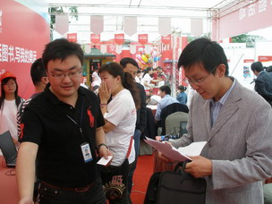 成都電視臺(tái)記者(右)在讀書周活動(dòng)現(xiàn)場(chǎng)